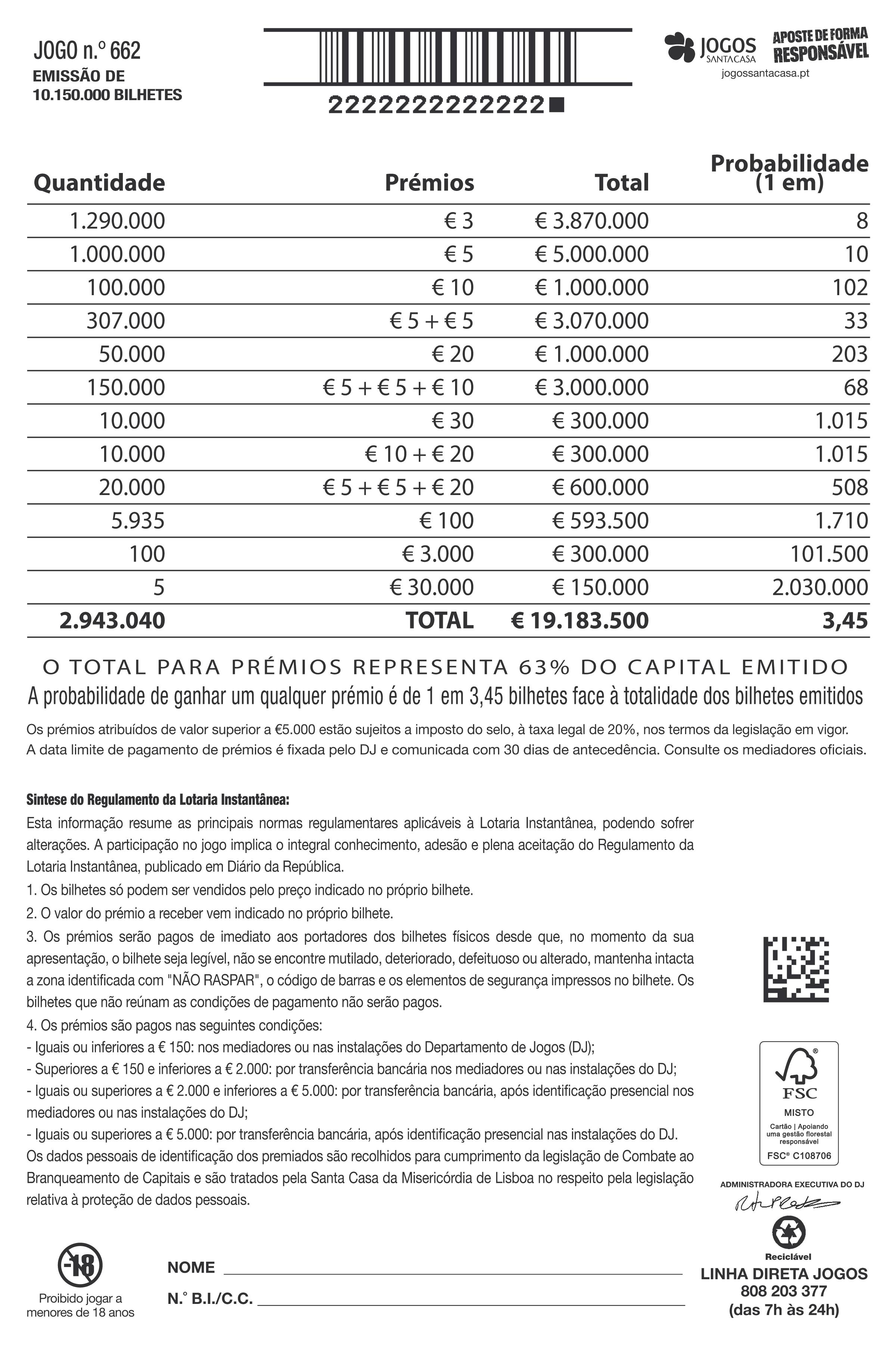 Preço do bilhete para o apostador - € 3