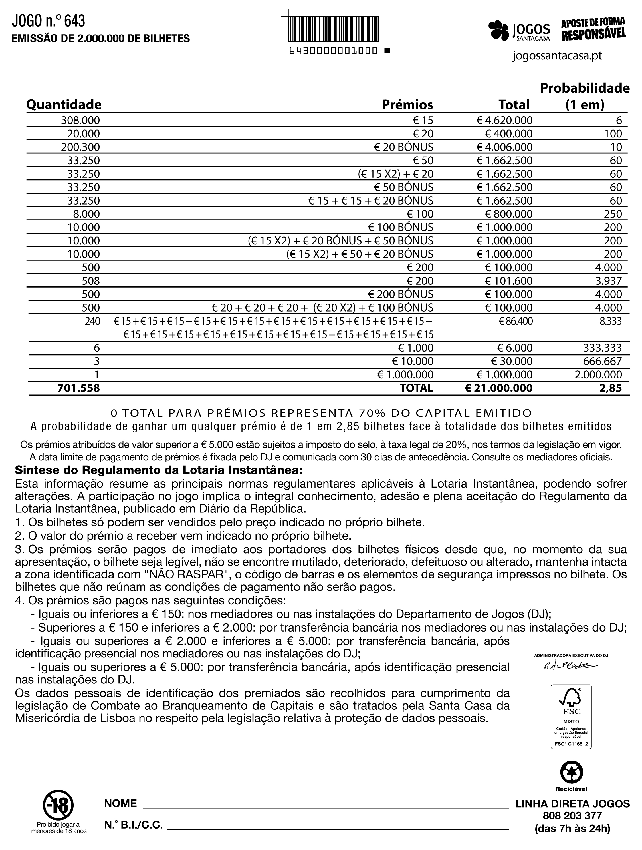 Preço do bilhete para o apostador - € 15